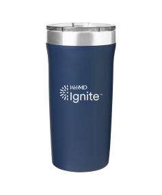 18 oz double wall 18/8 stainless steel thermal tumbler with vacuum insulation, brushed stainless steel rim, clear push-on acrylic lid with sliding closure, and powder coated finish. Hand wash recommended. Do not microwave. Complies with FDA, Prop 65. 7.25" H x 3.5" W