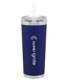 24 oz double wall 18/8 stainless steel thermal tumbler with copper vacuum insulation, stainless steel rim and base, threaded Eastman Tritan lid, snap closure, straw opening, and flexible wide silicone straw.
