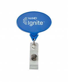 Oval design features rotating alligator clip for universal use. 30" sturdy nylon retracting cord and strong snap lock. Rotating alligator clip on back.